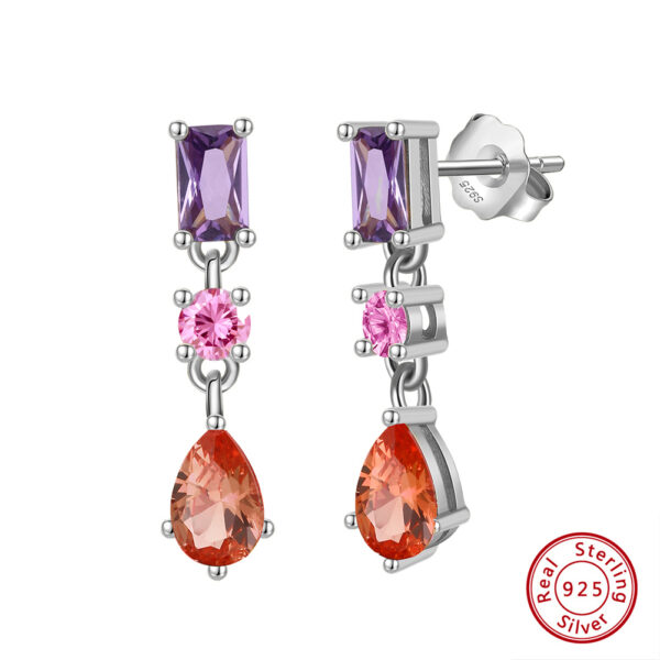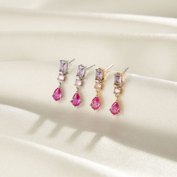 Each earring features dazzling AAAA Cubic Zirconia stones in soft pink, purple, and red hues — creating a romantic, feminine charm.