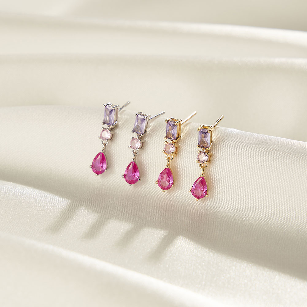 Each earring features dazzling AAAA Cubic Zirconia stones in soft pink, purple, and red hues — creating a romantic, feminine charm.